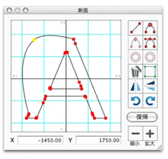 断面パレットを使ってオブジェクトの断面の編集ができます。ハンドルを追加して、弧、スプライン、ベジェなどの機能を使って、自由に形を作ることができます。断面図を編集ウインドウの形態が変更を反映され、編集結果をすぐ見ることができます。