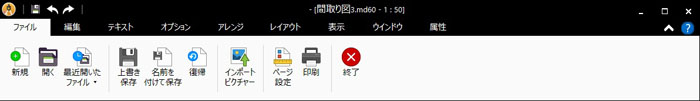 エクセルなどのような最新のWindowsリボンインタフェースになりました。メニューの項目はウインドウに上にアイコンで表示され非常にわかりやすくて、使いやすくなりました。 また、属性パレットとサイズ変更パレットが属性リボンにまとまり、図形の作成と編集がさらに楽になりました。 |