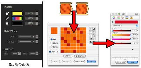 線、面の塗りにお好みの色を付けることができ、カラーパレットにない色はシステム標準のカラーパレットから色を作り出すことができます。さらに、塗りつぶ