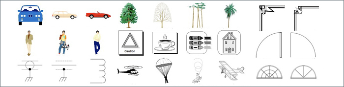 ドラフティングキャドプロ 6 for WindowsにはMacintosh版と同様な新型ライブラリ集が付いています。建築、電子記号、イラスト等のシンボル2,000以上が収録されています。 建築関係:窓、ドア、屋根、など建築関係の様々な部品を網羅し、ビルなどの設計図に使われるシンボルも多数収録されています。 電子記号:一般的な電子部品と、ロジックシンボルなどが含まれています。 グラフィック1:人物、自動車およびトラック、樹木、家具などが収録されています。 グラフィック2:組織図や文房具のイラスト、間取り図用の家具など、フローチャートのパーツ、罫(フレーム)が収録されています。 ※製品版のライブラリの中身が多少変わる場合があります。 |