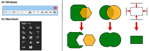 | オブジェクトの編集がパワフルに、かつフレキシブルに行える「高度ツール」が非常に役に立ちます。オブジェクトハンドルの追加/削除、開いたオブジェクトを閉じたオブジェクトに変更する結合、その逆の分離、2つのオブジェクトの合体/切り抜き、線の延長/切り落とし/トリミング、オブジェクトを反転させるミラー、オブジェクト同士のハンドル部分を連動させるリンク機能などを装備し、描画ツールで描いた図形をさらに複雑に変化させることによって、多種多様な形の図形を生成することが可能となります。 |