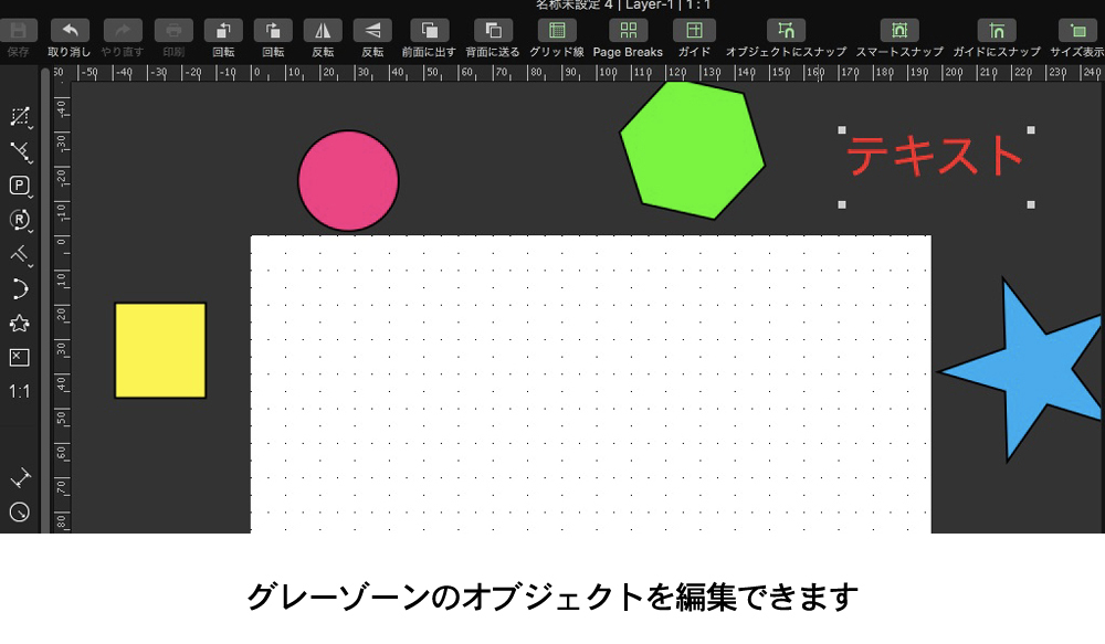白い図面の周りにある部分はグレーゾーンになっていますが、ここに図形などを置けます。バージョン7からグレーゾンにある図形などを編集できるようになりました。 |