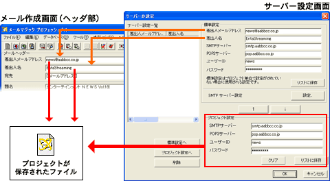 また、プロジェクト設定という設定項目を設け、ここに設定したサーバー(アカウント)設定の内容は、作成しているメールを保存する際に一緒に保存されます。プロジェクト毎にサーバー(アカウント)の設定を記録しておくことで、間違って別の設定で送信してしまうミスや、以前送信した設定を忘れてしまうことを防げます。