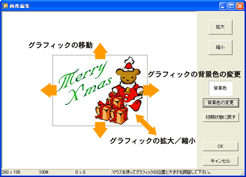 | HTML テンプレートのグラフィック部分にはお好みのグラフィックを挿入することができます。しかし、いざ自分の作ったグラフィックや撮影した写真をテンプレートに挿入しようとしても、テンプレートに挿入できるグラフィックは大概大きさや縦横比に規制があり、挿入してもきれいに表示されない場合があります。そこで『メールマジック パーソナル』には簡単なグラフィック編集機能をご用意しました。 |